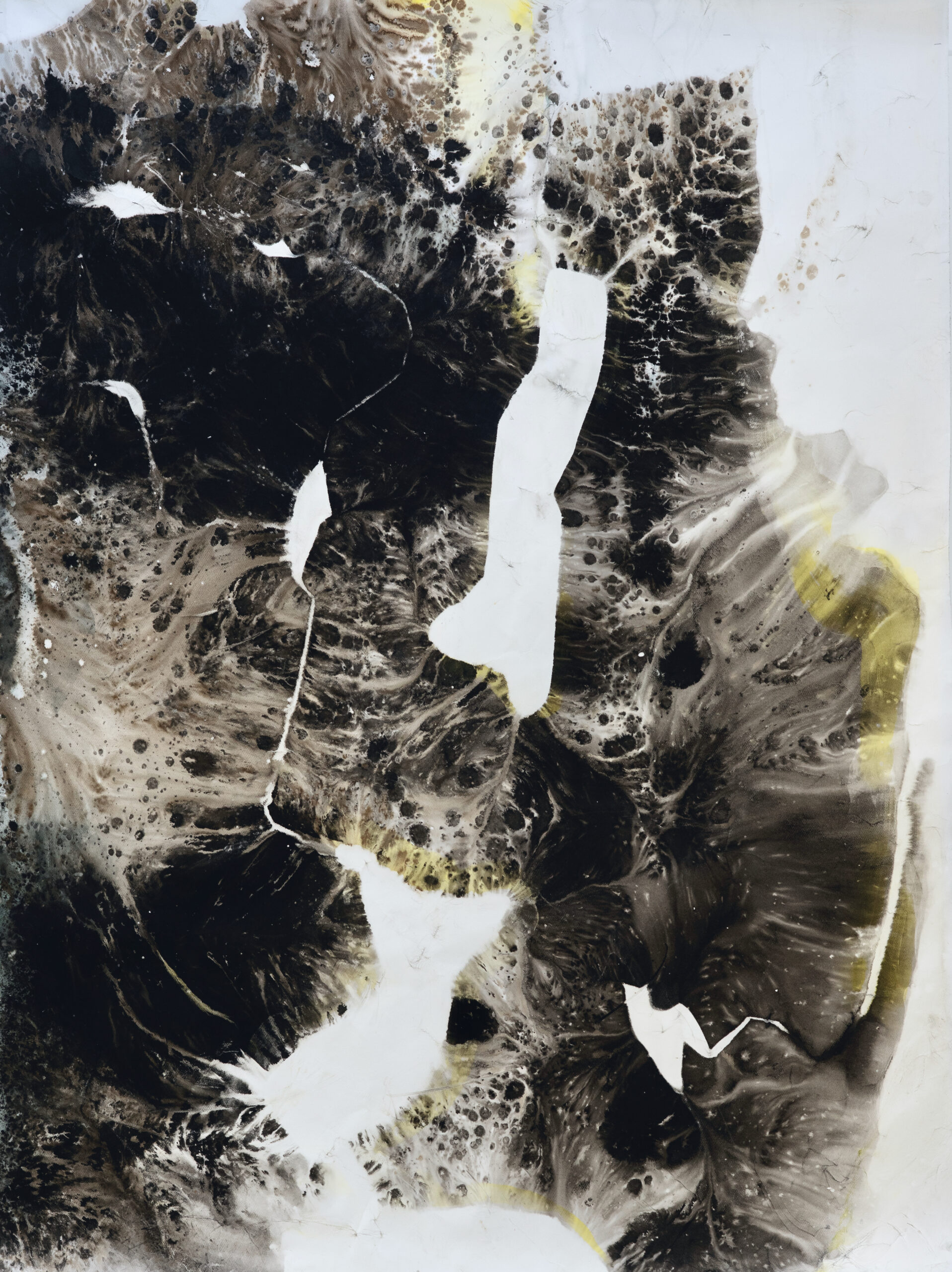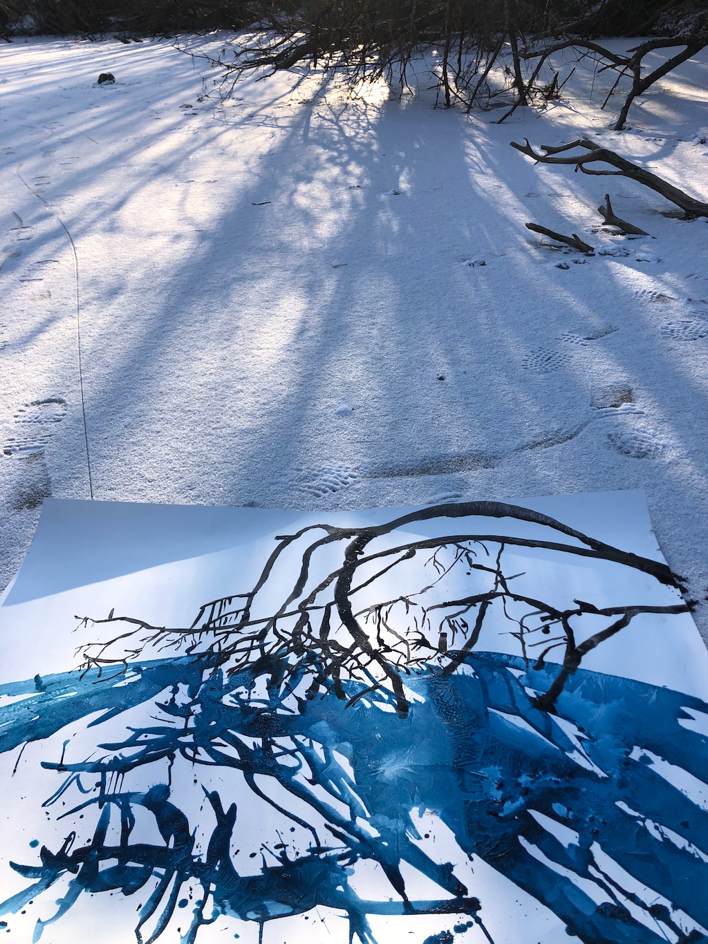 As the first winter approached and temperature dropped below zero, my ink froze on the paper leaving frosty marks whilst I was painting. This is simple physics, but at the time it felt like a revelation. The traces of nature in my artwork, showing itself in a different image, rather than a depicted landscape. Thus began my journey to explore the impact of the forest in its shifting seasons in my artwork. I became interested in deep ecology principles. Frost, snow, rain, shadows cast from the sun, the whirling waters in the river, forest slugs and microorganisms have made marks on my works at some point during these years.
